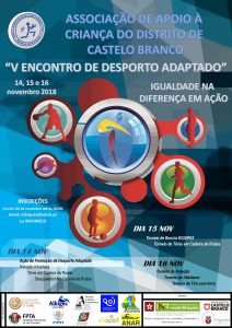 A Associação de Apoio à Criança do Distrito de Castelo Branco (AACCB), vai trazer ao encontro da população Albicastrense o “V Encontro de Desporto Adaptado”, a decorrer entre os dias 14,15 e 16 de novembro de 2018, na cidade de Castelo Branco.